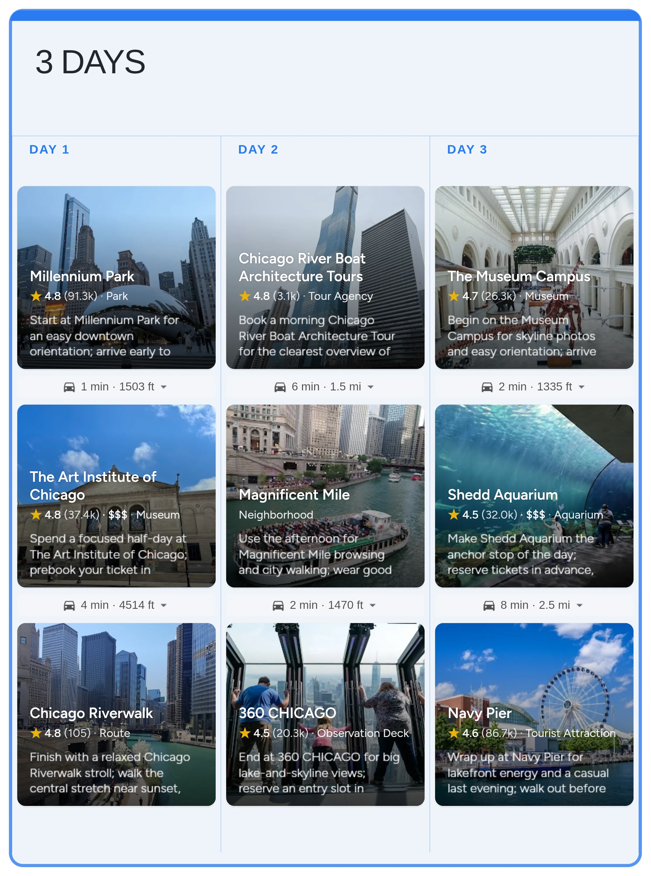 Start with the real Chicago board in Instaboard - mapped stops, day-by-day structure, and live sharing - then tailor the pacing, bookings, and notes to your trip.