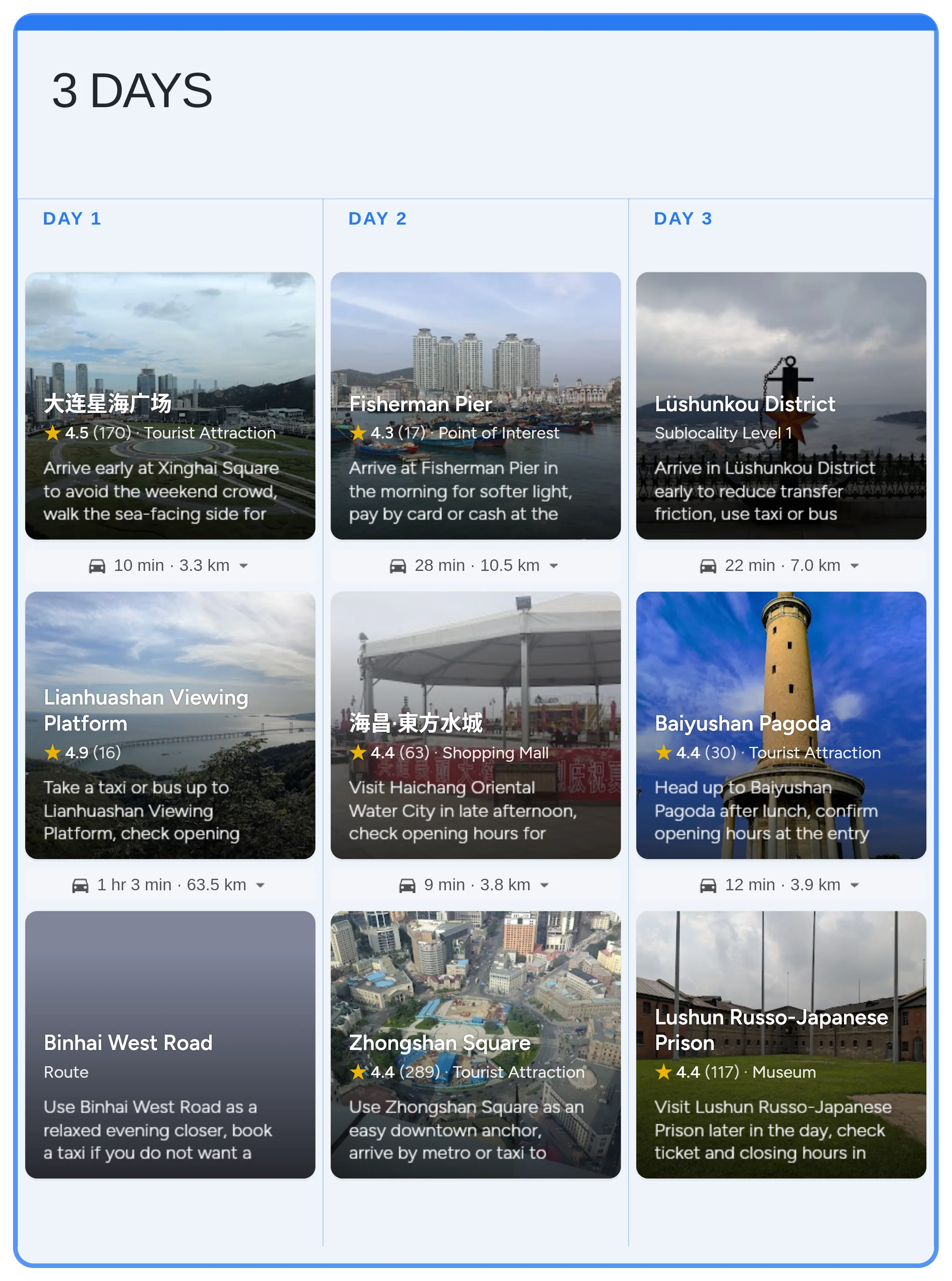 Plan a flexible 3-day Dalian city break with waterfront walks, skyline viewpoints, and a history-focused side trip to Lushun. This itinerary highlights iconic squares, coastal scenery, and easy-to-sequence must-sees for first-time visitors.