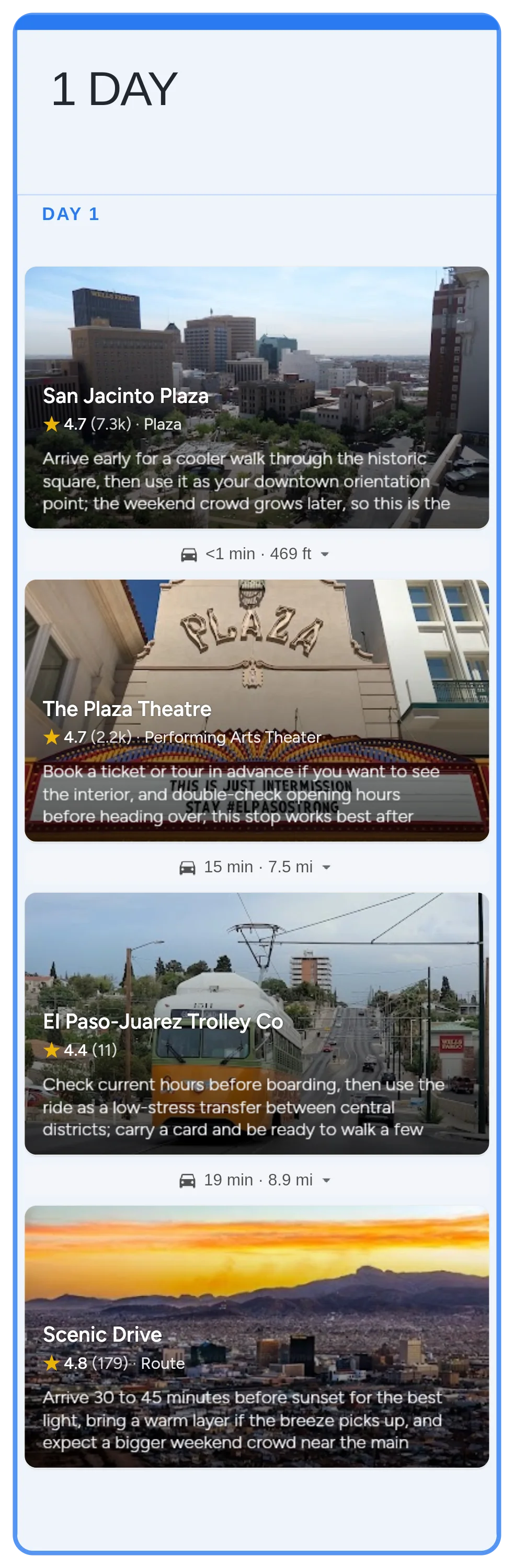 Start with the real El Paso board in Instaboard - mapped stops, day-by-day structure, and live sharing - then tailor the pacing, bookings, and notes to your trip.