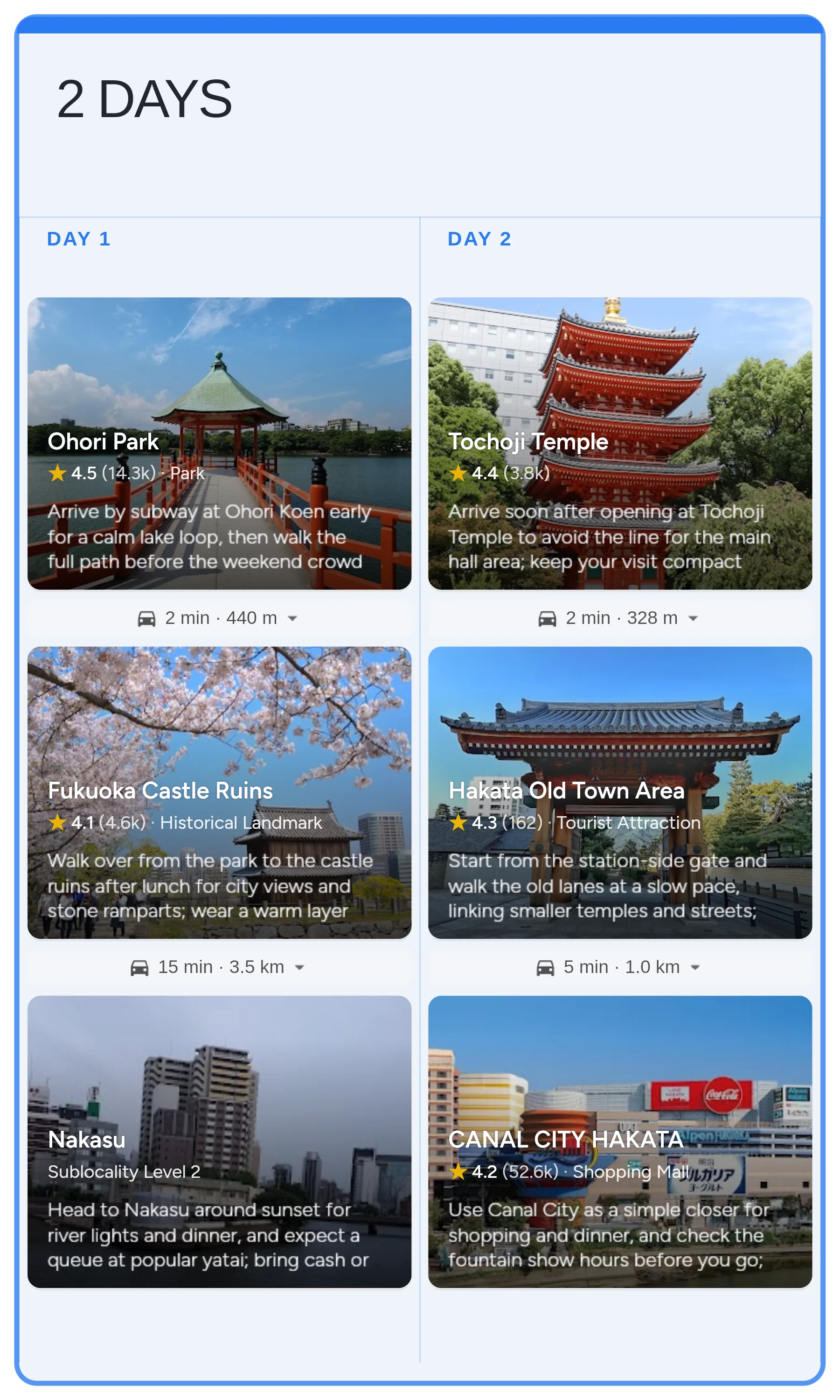 Start with the real Fukuoka board in Instaboard - mapped stops, day-by-day structure, and live sharing - then tailor the pacing, bookings, and notes to your trip.