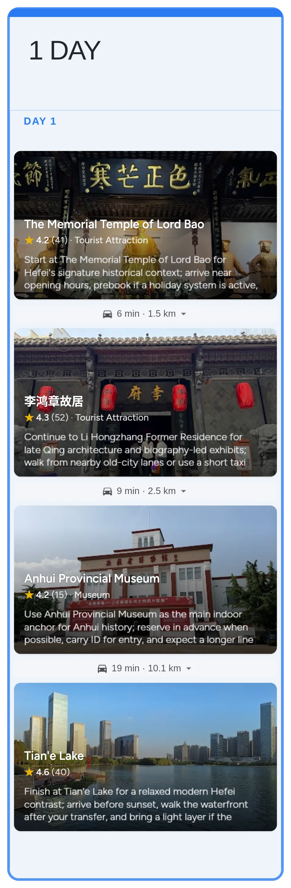Start with the real Hefei board in Instaboard - mapped stops, day-by-day structure, and live sharing - then tailor the pacing, bookings, and notes to your trip.