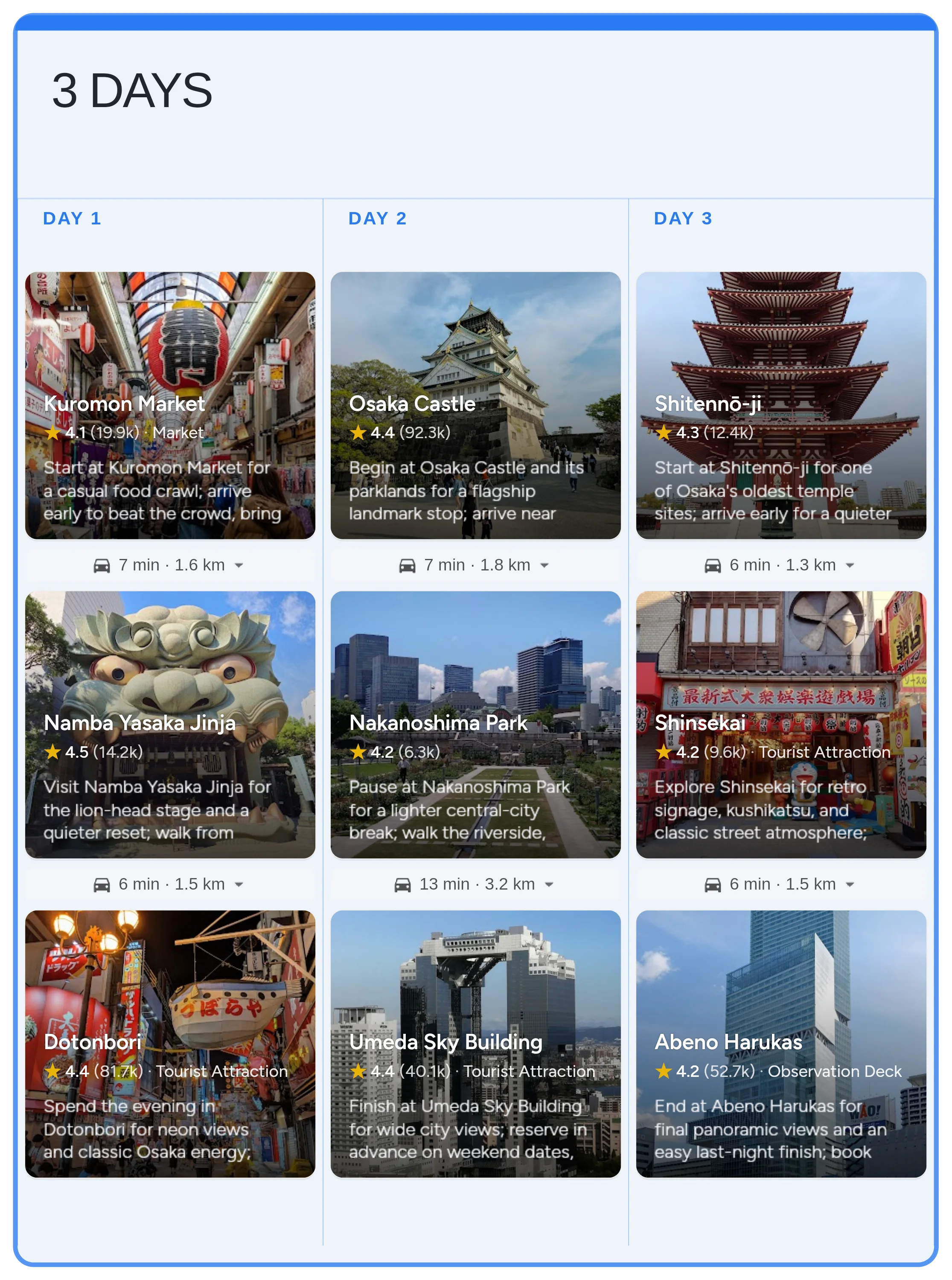 Start with the real Osaka board in Instaboard - mapped stops, day-by-day structure, and live sharing - then tailor the pacing, bookings, and notes to your trip.