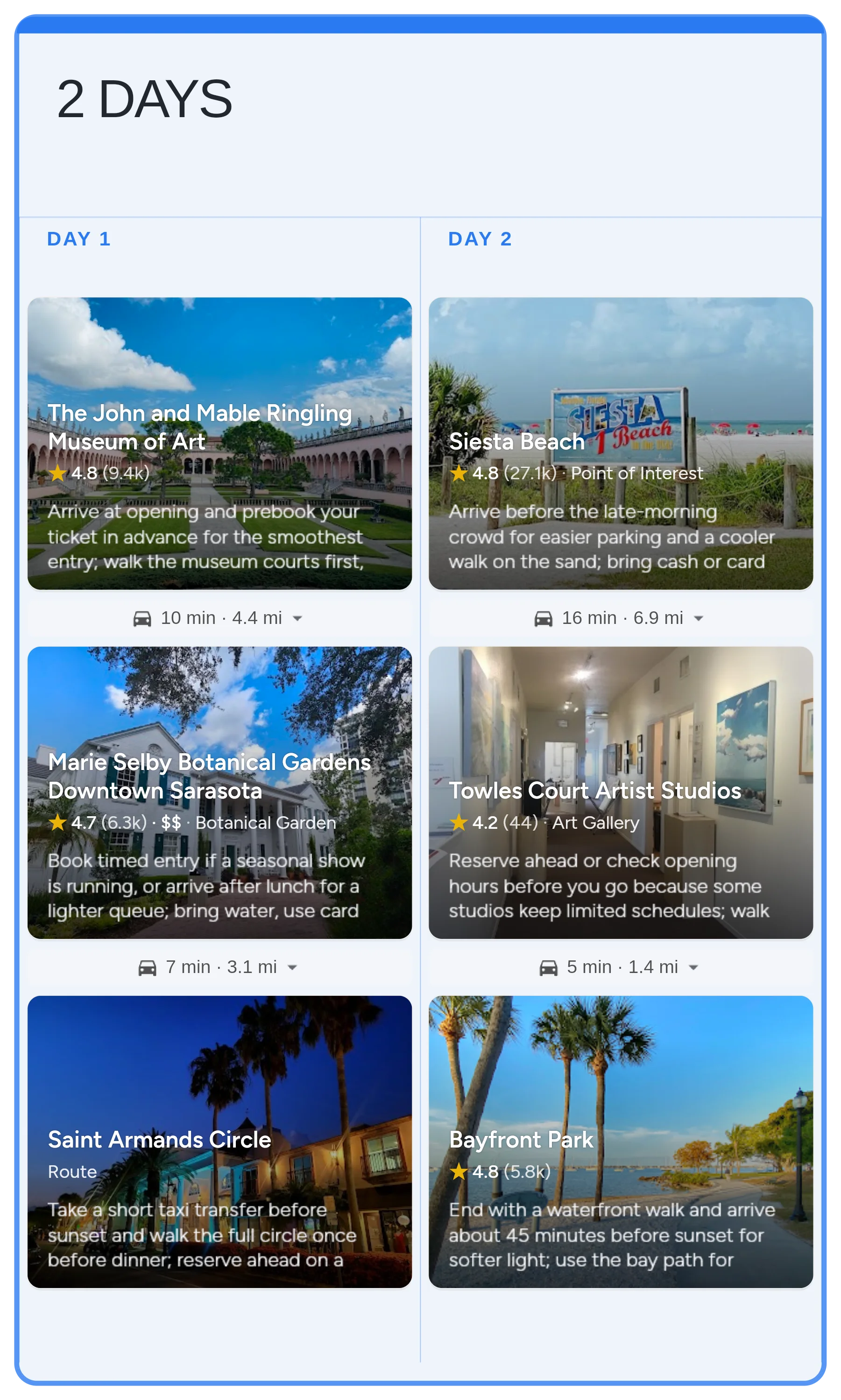 Start with the real Sarasota board in Instaboard - mapped stops, day-by-day structure, and live sharing - then tailor the pacing, bookings, and notes to your trip.