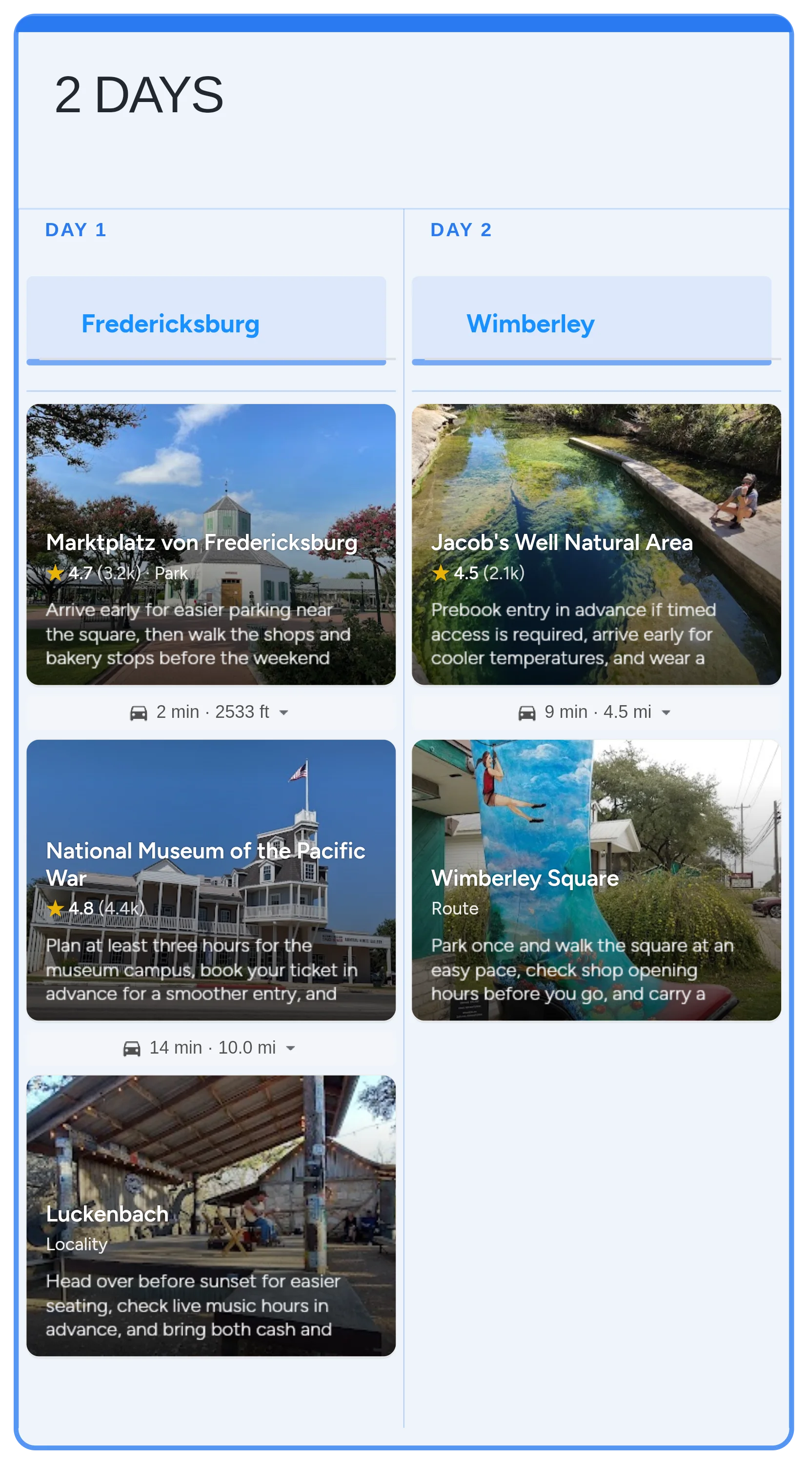 Build a quick 2-day Texas Hill Country loop through Fredericksburg and Wimberley with town squares, iconic live music, a standout museum, and classic swimming-hole scenery. Best conditions tend to run April through October for wildflowers and water time.