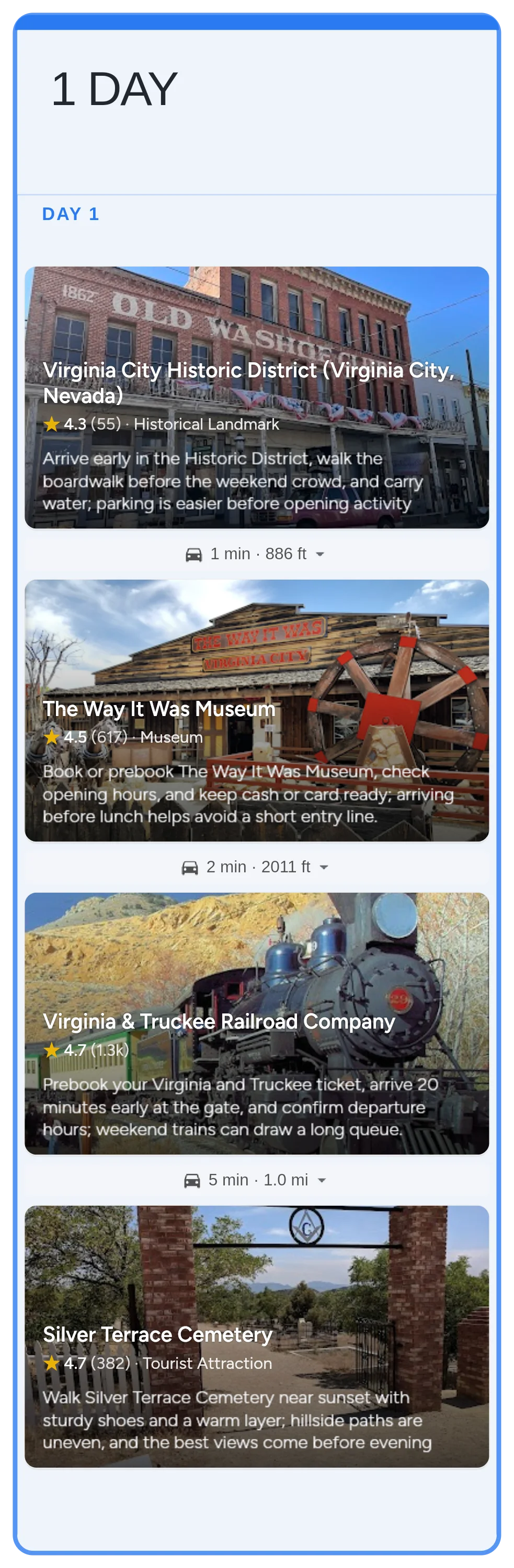 Start with the real Virginia City board in Instaboard - mapped stops, day-by-day structure, and live sharing - then tailor the pacing, bookings, and notes to your trip.