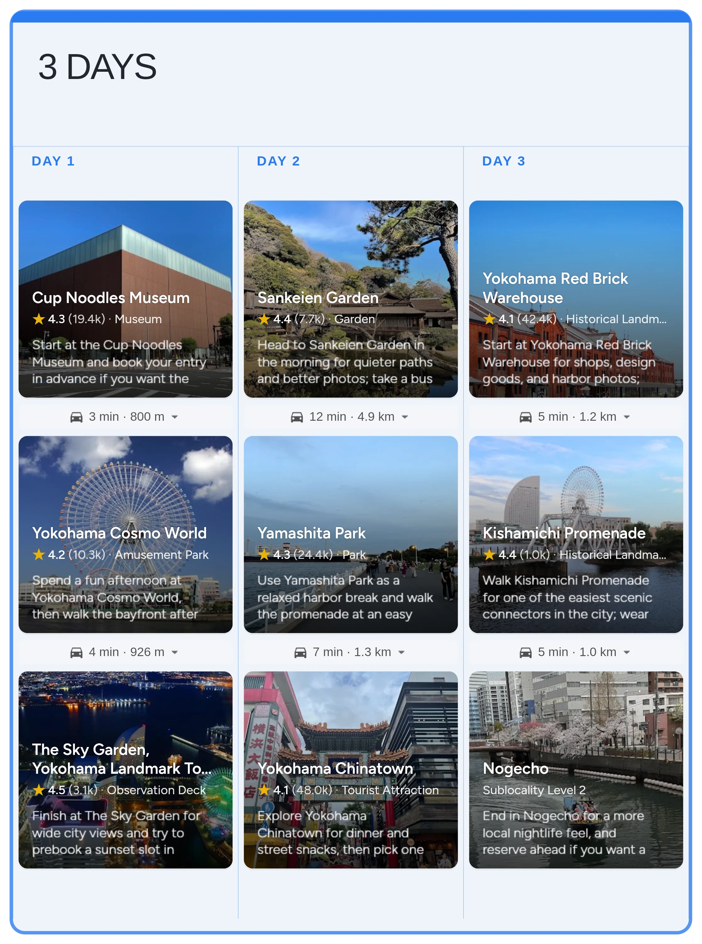 Start with the real Yokohama board in Instaboard - mapped stops, day-by-day structure, and live sharing - then tailor the pacing, bookings, and notes to your trip.